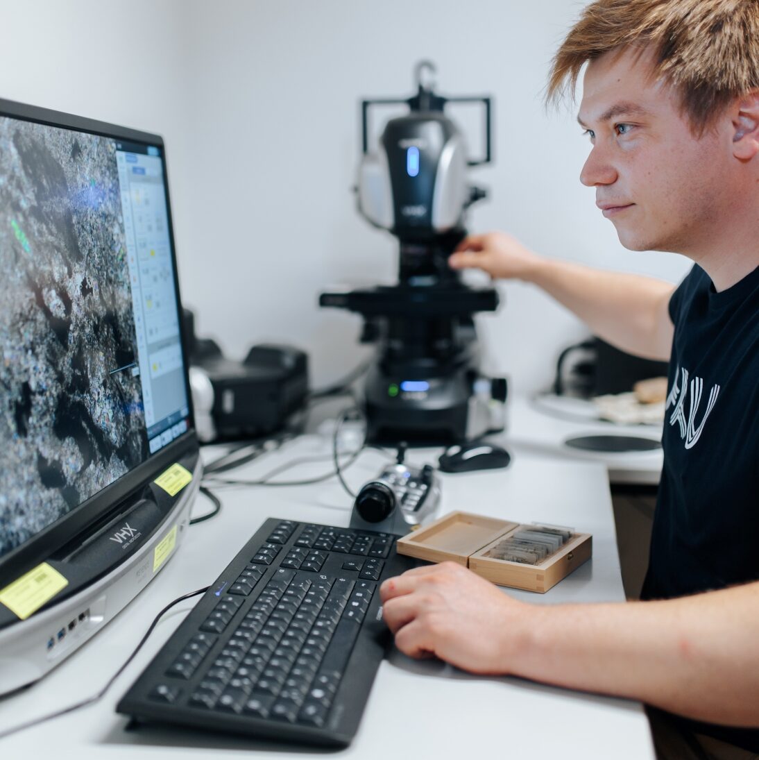 We use a Keyence VHX-7000 digital microscope with a magnification of x20 – x2400 for taking high-resolution images of thin sections and rock samples.
