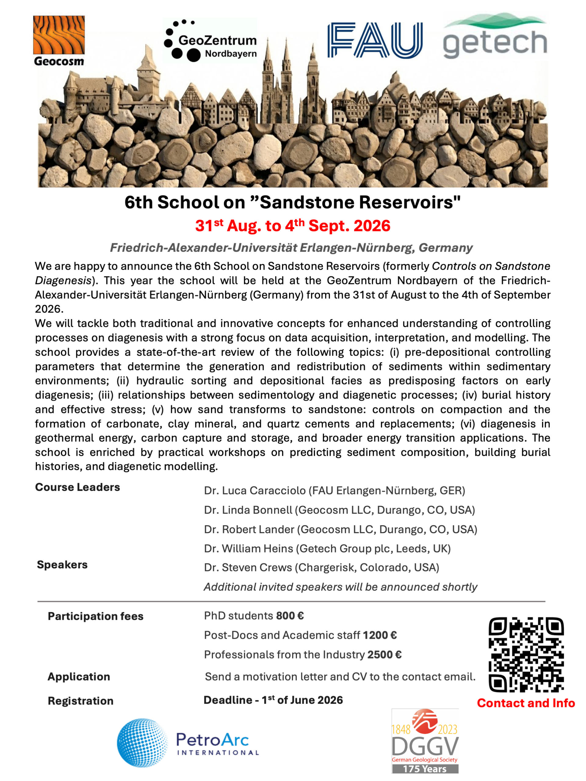 We are happy to announce the 6th School on Sandstone Reservoirs (formerly Controls on Sandstone Diagenesis). This year the school will be held at the GeoZentrum Nordbayern of the Friedrich-Alexander-Universität Erlangen-Nürnberg (Germany) from the 31st of August to the 4th of September 2026.