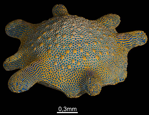 Morphological analyses of the shells of marine unicellular organisms in the submillimeter range. The raw 3D volumes are displayed in grayscale depending on the material density. Software can be used to segment this grayscale data into colors, which allows structures such as surfaces to be displayed more clearly. In the case of the recent foraminifer Calcarina, the calcareous shell and the cavity (blue) enclosed by the shell (yellow) are shown here.