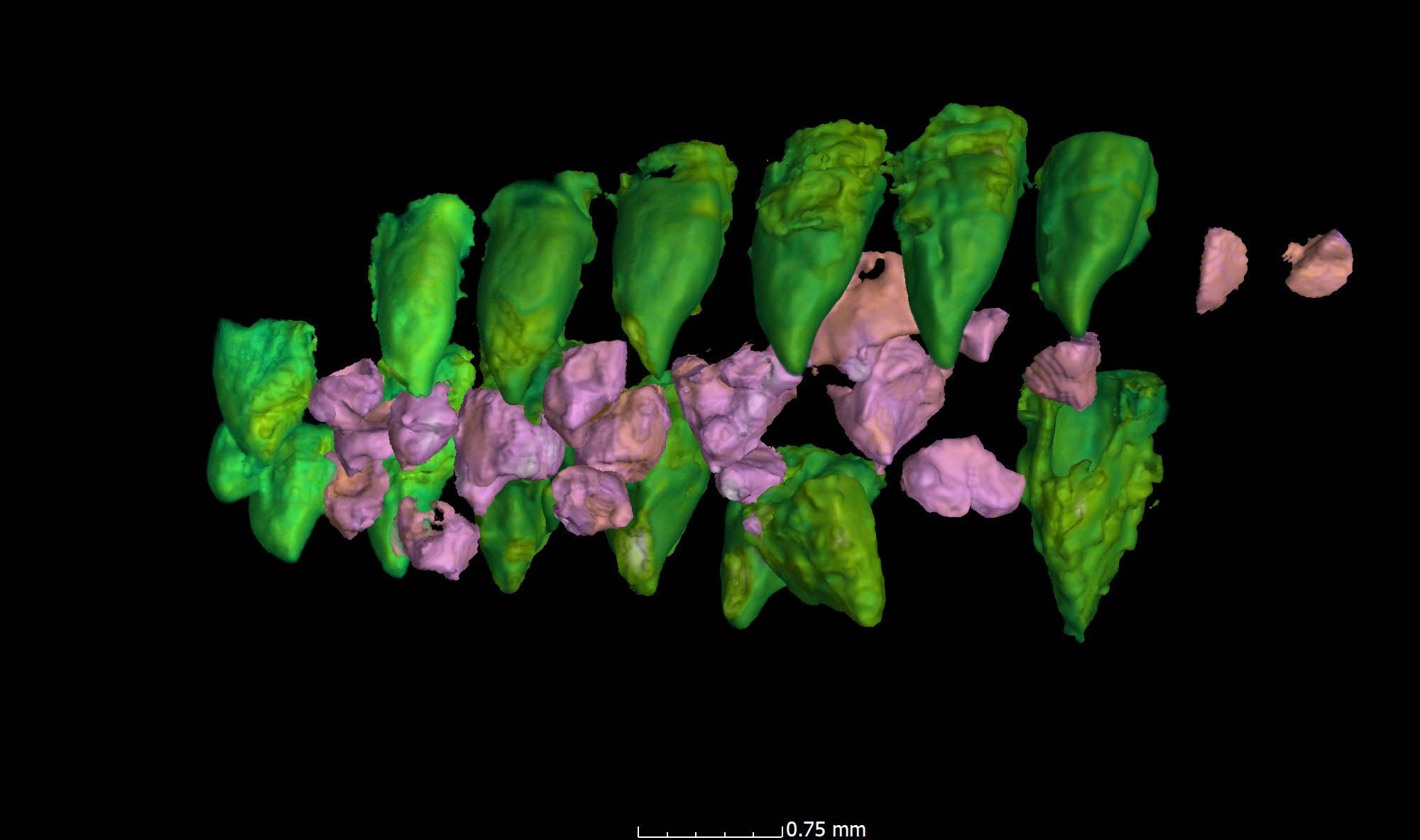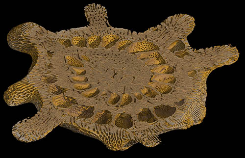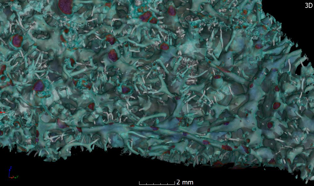 While a two-dimensional cross-section of an object already provides a wealth of information, this can be greatly expanded upon by using 3D representations of structures. Here, the cavities in the limestone have been vividly depicted, while the limestone itself has been removed or hidden. This structure was created by the marine boring sponge Cliona, which connects its many chambers with fine channels.