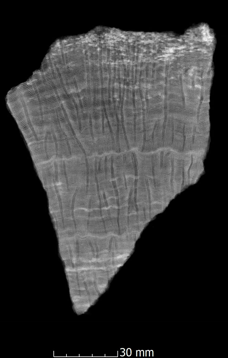 Coral skeletons are an excellent archive for climate research into temperature developments during the Pleistocene. Growth rates can be calculated, for example, using growth lines on the coral skeleton. In a seasonal rhythm, corals alternately build dense and less dense stripes into their skeletons. These differences in density can be easily detected and measured using computer tomography methods.